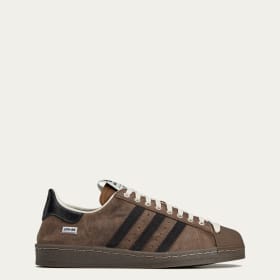 The Men's Song for the Mute Superstar 82 Shoes are premium low-top sneakers blending classic sport heritage with contemporary street style, created in collaboration with Song for the Mute and adidas. They feature a luxurious hand-buffed leather or suede upper, a signature rubber shell toe or tonal leather shell toe, aluminum eyelets, and waxed laces for a refined finish. The design includes leather stripe motif patches on the side panels and a rubber midsole and outsole for durability and grip. These shoes evoke a work boot-inspired ruggedness with a sophisticated execution suited for stylish casual wear and modern urban lifestyles.